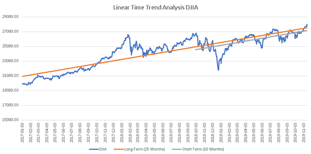The blue line is the actual price point at specific points in times. We see in uptrend line in the DJIA with a positive slope which connects two or more data points. Each low is higher than before. Regarding the Long-term, starting on January 3, 2017, the Dow was at 19,882 points. To the current date, November 15, 2019, the dow rose to 28,005 points. That’s a 8,123 point increase in 2 years and 11.5 months.