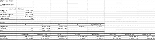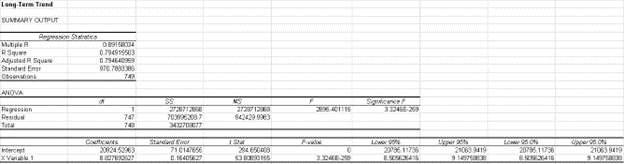 When we look at the Short-term Regression Analysis, we see a not so good “R Square of 0.46” which means there’s a weak relationship between the Y axis (dollars) and X axis (time). This means 46% of the data points fall away from the regression line. A R Square of less than .70 indicate a weak correlation between the Y axis and X axis. In our regression analysis our equation is the following Y = 20924.52963 + 8.827692627 * (Time). This can be interpreted by staying the DJIA increase about $8.82 per day. Again, we used an “Observations” of 295 days (10-1-2018 to 11-15-2019).
