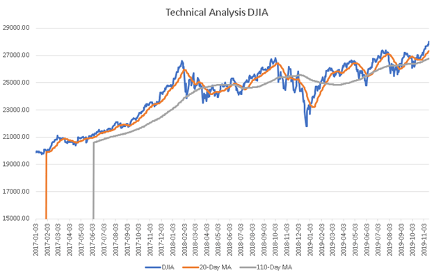 When we completed our Technical Analysis DJIA graph we had to look at the Moving Averages for 20 days and 110 days. When our graph was completed here’s what it looked like.