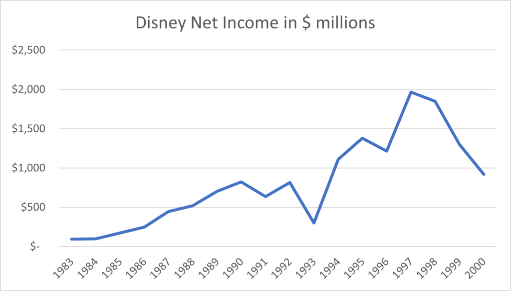 We looked at the Disney cash flows from 1983 to 2000. Disney Net Income grew over the 17 years that Eisner was CEO and here’s what it looks like on the graph below.