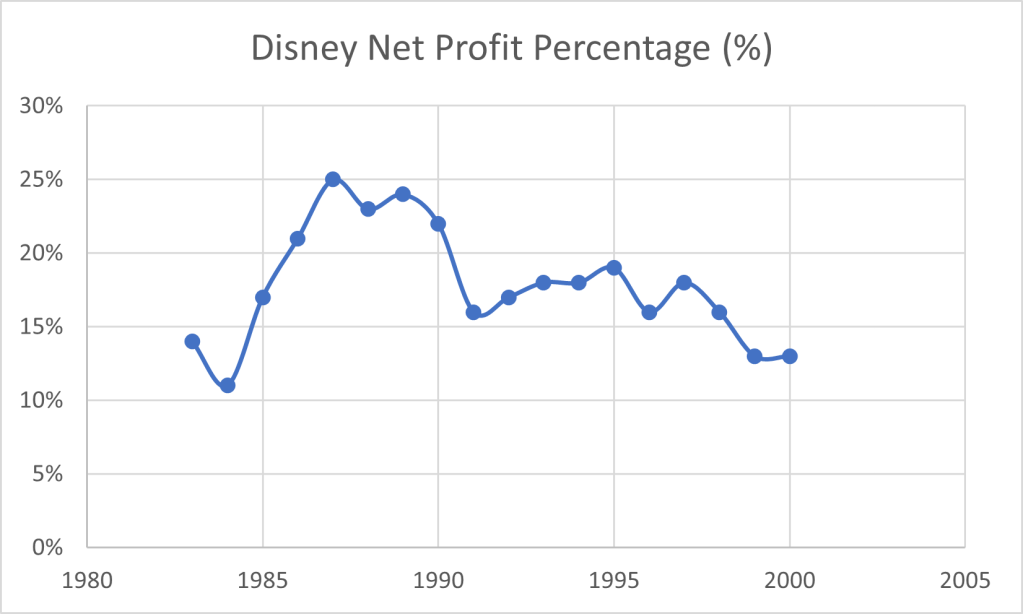 TheNet Profit Percent shows the after-tax profits to net sales. It shows the remaining profit after production, administration, and financing. Disney experienced a low Net Profit Percentage of 11% in 1984 and a high Net Profit Percentage of 25% in 1987.